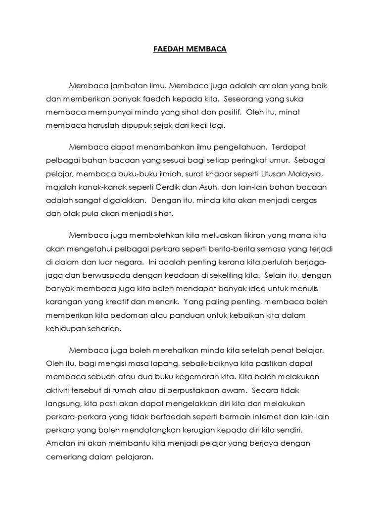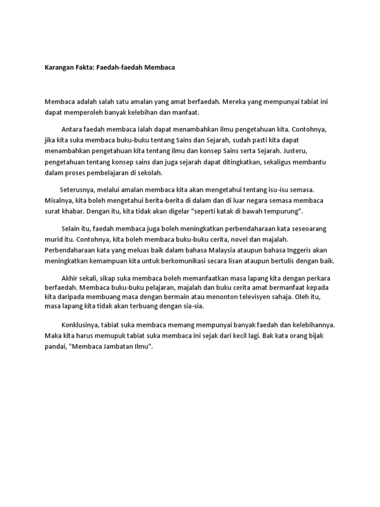 Karangan Fakta- Faedah Membaca. Semua lapisan masyarakat haruslah berusaha mengamalkan budaya membaca kerana Membaca Jambatan Ilmu. Manfaat Amalan Membaca Khusus kepada tingkatan 4 Rekayasa.