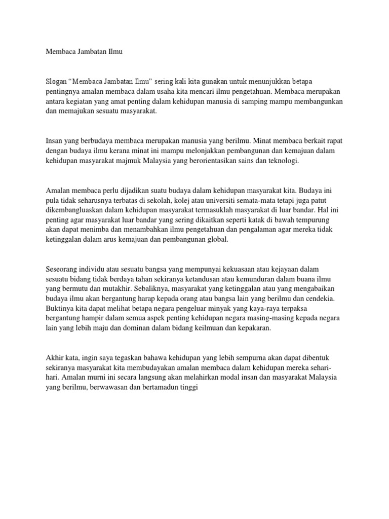 SPM - Karangan Umum. Selain itu slogan tersebut turut menegaskan bahawa kita mestilah membaca bagi. Amalan membaca merupakan permulaan positif sebagai langkah pertama dalam penjanaan dan penyebaran ilmu.